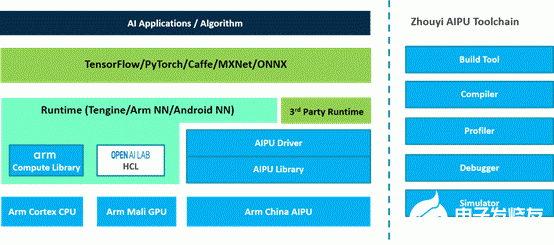 Arm中国2018年11月发布的“周易”平台,主要包括两部分,一是AIPU,二是Tengine框架。AIPU最大的特点就是拥有一套AI和神经网络优化指令集,实现包括张量指令、实现定制硬件加速单元的特定AI指令,以及AI计算的标量指令等,另外也支持用户自定义硬件实现。