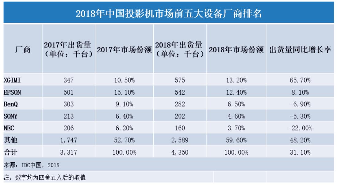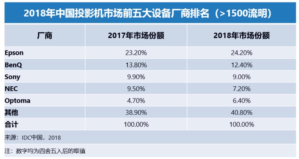 从品牌竞争看,2018年全年投影机市场排名(按销量计算)前五大厂商为XGIMI,Epson,BenQ,Sony,NEC,国有品牌极米首次问鼎年度冠军。按照销售金额计算,Epson,XGIMI,Sony,BenQ和海信排名前五。如果限定亮度在1500流明以上产品分类,市场出货量前五名是Epson,BenQ,Sony,NEC和Optoma。
