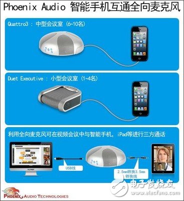 美国 Phoenix Audio Technology(凤凰语音科技有限公司)经过多年的研发,推出了可以与所有智能手机、平板电脑、PSTN 模拟电话进行互通的 Quattro3 MT303 和 Duet EXE 全向麦克风。鼎曛(上海)商贸有限公司作为 Phoenix Audio 的中国独家总代理,已于2012年10月25日面向各企事业单位正式启动“Q3 MT303/Duet Exe免费体验活动”。