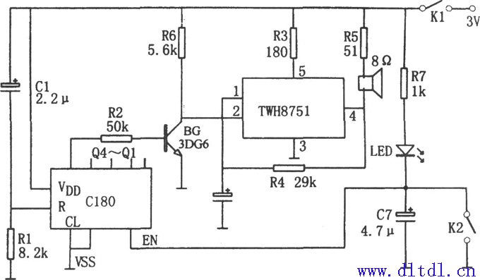 电路在调试时,先闭合计数开关K2,再闭合电源开关K1,使LED亮,Q1~Q4均为低电平。然后将K2打开再合上共八次,Q4为高电平,调整R2使BG导通,喇叭发声,调节R4可改变发音的声调,调节R5可改变音量的大小。