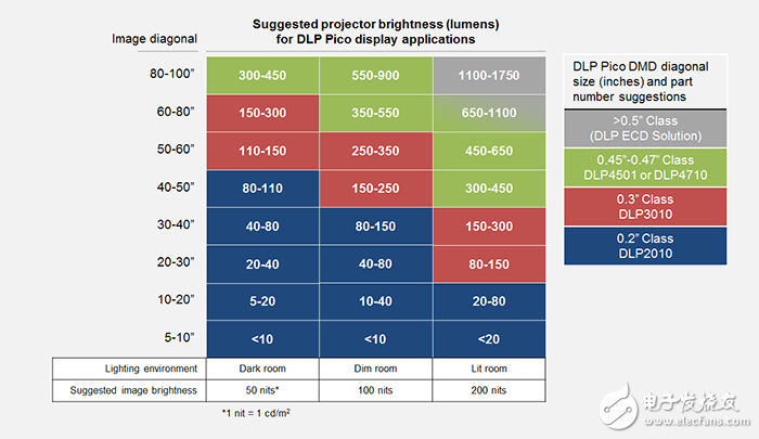 通常情况下,屏幕尺寸越大,图像所需亮度越高,投影机的亮度也要越大。此外,周围环境光的强度会明显影响特定屏幕尺寸所需的亮度。综合考虑投射画面大小和周边环境光的因素,用户在使用DLP Pico芯片设计整机系统时,可以参考下图1建议的投影机亮度值和相应的DLP芯片组。