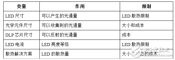要回答能够实现多大亮度这一问题,十分重要的一点是理解表格1中那些可以在系统设计时进行更改的关键变量。要实现一个亮度更高的LED投影解决方案,往往需要将其中的一些变量调高。