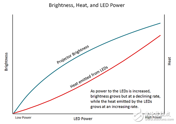 如果给光学模块的LED通电并且将视频内容传送至DLP控制芯片,那么光学模块会投射出图像。如图3所示,当LED上的功率增加时,亮度随之增加,但增速变慢;同时,LED的发热量会越来越大。