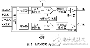 MAX5556内部结构如图3所示,MCLK为主时钟,LRCLK为左/右声道选择时钟,SCLK为外部串行时钟,SDATA为串行音频输入,OUTL/OUTR为左/右声道输出。串行接口模块获取音频数据后,由内置数字插值器、滤波器对其进行滤波,以去除基带音频信号携带的谐波噪声;音频数据经∑-△调制器调制后由DAC转换,输出的模拟信号经由内部的模拟低通滤波器进行滤波,衰减高频量化噪声;内置输出缓存器能驱动大于3 kΩ的负载电阻和高达100 pF的负载电容;最终模拟音频信号从OUTL/OUTR输出。