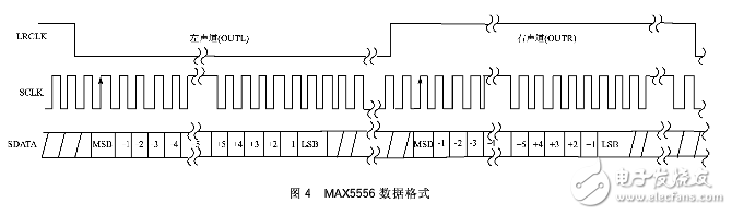 MAX5556支持左对齐16位或者24位数据格式。当其工作在外部串行时钟模式,或工作在内部串行时钟模式,且同时MCLK与LRCLK的比值为384时,有效数据为24位。如果数据不足24位,低位补零;超过24位的数据会被忽略。当工作在内部串行时钟模式,且MCLK与LRCLK的比值为256或512时,有效数据为16位。MAX5556数据格式如图4所示。每次LRCLK沿变化后的第二个SCLK上升沿时,SDATA上数据开始有效,出现最高有效位(MSB);24个或者16个时钟周期后出现最低位有效位(LSB)。LRCLK为0时,数据进入左声道DAC;LRCLK为1时,数据进入右声道DAC。