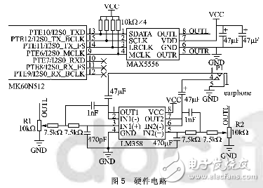 MK60N512是飞思卡尔公司Kinetis系列微控制器集成度最高的芯片,它基于ARM Cortex—M4内核,具有功耗低、性能高、成本低的特点,旨在为嵌入式音频、汽车电子和电源管理等提供灵活的解决方案。MAX5556是美信公司一款低功耗、立体声音频数/模转换器(DAC),支持标准I2S总线协议,采样精度最高可达24位,采样率为2~50 kHz。采用∑-△调制技术,能够对量化噪声进行有效整形,减小量化噪声。