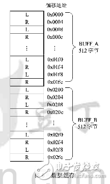 MK60N512的I2S总线模块在I2S总线模式下支持双声道,音频数据在FIFO中交错存放,因此在缓存中的音频数据也需要交错存放。数据缓存如图6所示,其中L/R表示音频左/右声道。每个音频数据占用4个字节空间,缓存BUFF_A、BUFF_B在物理地址上是连续的,它们大小均为512字节,共存储256个音频数据。当DMA从缓区BUFF_A中读取数据时,CPU向缓存区BUFF_B中存储下一组音频信号;当DMA将BUFF_A中的数据全部传输结束后,将DMA通道源地址切换到BUFF_B,同时CPU向BUFF_A存储数据,如此反复。