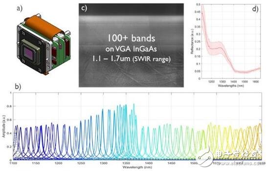 图为Imec的高光谱SWIR波段成像仪初步测试结果:a)短波红外成像仪,b)1.1~1.7μm波段校准后的100 +光谱带分析图,c)640 x 480像素空间分辨率的人手和像素级100 +光谱带阶梯滤波器沉积和图案化的实时原始图像(RAW image),d)扫描后皮肤反射率的光谱图