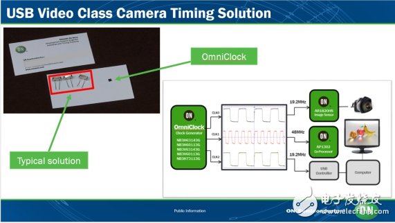 USB视频摄像机是个很好的例子,证明OmniClock器件相对于基于晶体的时序方案可提供的全系列优势(观看视频)。在这类应用中,单个OmniClock器件可以配置以支持所需的3个频率:19.2兆赫(x2)和48兆赫,从而省去了多个晶体或晶振。在辐射令人担忧的应用中,OmniClock器件令不同的扩频配置文件被定义在每个配置以确保板符合EMI标准。