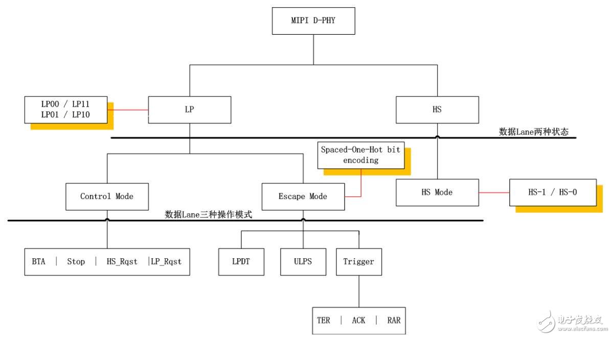 1、如上图所示,从数据 Lane 的状态来划分,D-PHY一共分为两种状态,即低功耗状态(LP)和高速状态 (HS), LP 状态下主要是发送一些控制类的命令,数据量相对较小(LP 状态下也可以发送图像数据,在 LPDT 模式下就可以),采用单端数据传输。HS 状态下主要是进行大数据量的图像数据的传输,采用差分传输。