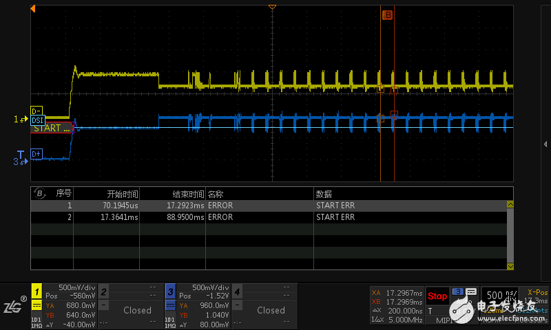对于初始化部分,低速初始化信号我们可以轻松的抓到,然而对于现在不同的屏幕厂商,其初始化部分不尽相同,如果初始化采用的为高速信号,而我们依然使用低带宽的示波器,有可能抓不到,或是即使抓到的也是错误波形,不能分析,如下图所示: