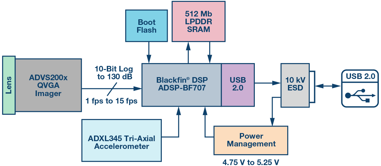 ADIS1700x是一个小尺寸且具有对数敏感性的QVGA分析成像器模块,具有能够优化视频性能的数字信号处理功能。除了用于图像稳定、倾斜和冲击检测的加速度计,该模块还采用低功耗Blackfin处理器进行节点分析。此外,它还采用内置边缘检测技术跟踪和计算对象运动。与传统成像器不同的是,对数成像器的每个14 μm × 14 μm像素都具有一个独一无二的曝光相位。针对室外操作的保形涂层使其非常适用于大规模部署,从而可创建新兴智能城市和建筑应用。ADIS17001配备110°视场(FOV)镜头,而ADIS17002则配备67°FOV镜头。这两个选项适用于各种目标应用,包括停车场监控、停车违章执法、车流长度检测和工业分析。
