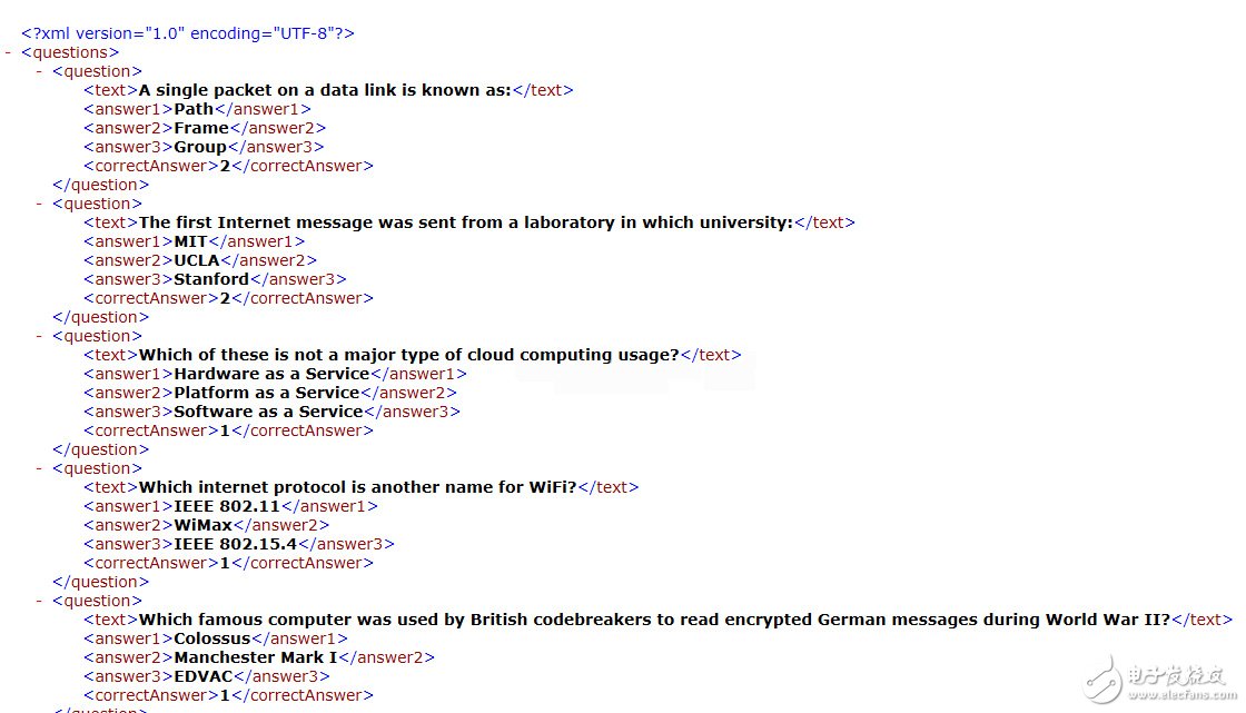 上图中,我们可以看到一个Assets文件,在这里,我们可以找到我们想要的内容,也就是Questions.xml文件,这个文件是描述这个demo的题库信息的文件,所有的题目信息都被写入了这个文件,可以双击打开看一看,如下图5所示,通过编辑这个文件可以修改题库,只是我们在编辑和修改该文件的时候一定要按照文件原有的格式进行,不然会出现读写信息错误。