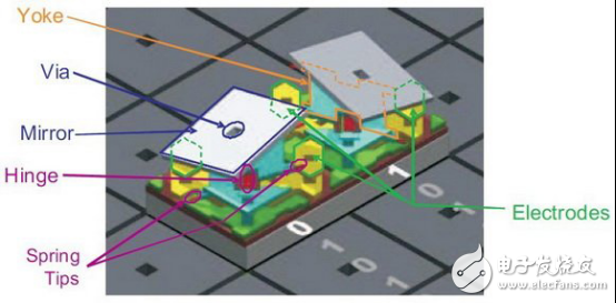 在DMD芯片,微反射镜是其最小的工作单位,也是影响其性能的关键。微反射镜的体积非常小,但是依然拥有不同于液晶的复杂机械结构——每块微反射镜都有独立的支撑架,并围绕铰接斜轴进行+/-12°进行的偏转。对于微反射镜这种微型机械,传统的机械或是液压控制已无法使用(即使能够使用,也会由于机械磨损而迅速损坏),因此在微反射镜的两角布置了两个电极,通过电压控制控制偏转,获得了高精度的控制能力和无限的偏振寿命。
