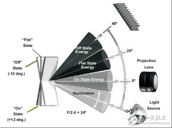 微反射镜是依靠反射光线工作的,其偏转能力是其关键,如上图所示这是一个偏转角度达+/-12°微反射镜的工作示意图,在微反射镜开启状态时(On State,+12°),入射光线(光源)的入射角达到12°,反射角亦达12°(两者相加即是24°),此时光能最大,即为(255,255,255);若微反射镜偏向关闭(Off State,-12°)状态,此时镜头接收到的光线越来越小,到达关闭状态时,亮度最低,即为(0,0,0)。