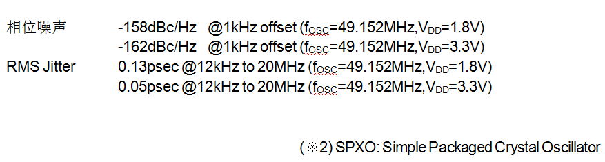 1. 作为面向SPXO※2的振荡IC,实现了世界高水准的低相位噪声和20MHz到50MHz的石英晶振组合使用,可获得超低相位噪声。既然可实现低相位噪声,那么RMS Jitter也会得到降低。