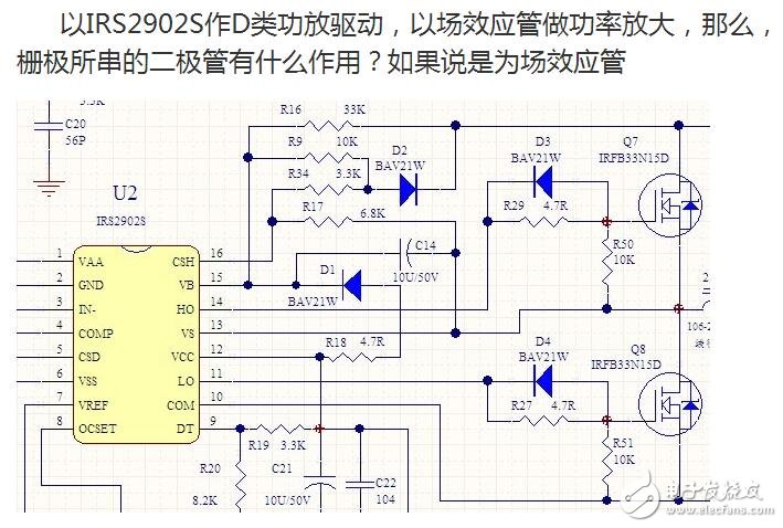 IRFB33N15D的VGS在3.0V至5.5V这间,实际驱动时,取决于IRS2902S的工作电压,实际都在10V左右,肖特基二极管D3的正向压降只有1.2V左右(电流1A,但其ΔV/ΔI约为0,动态内阻极低),已经可以确保Q7和栅极处于低于VGS以下,对关断没有影响。 另外,你要学习动态内阻的含义,如同电源,其压降可能是5V,但其内阻可以低达十几毫欧。