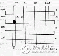 图1中选择点为(SEG1,COM2),以下简称为(1,2)。现第2行施加V1电压,其余各行电压0V;第一列施加-V2电压,其余均为非选择电压1/a‘V1.接下来分析各点的电位差,即行电压减去列电压。