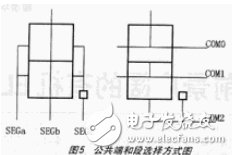 段码的使能通过LCDSE寄存器来实现。因为VIM807-2是8位7段显示器,而我们选择的是1/3占空比(即3个公共端),因此,通过LCDSE寄存器必须选择3×8=24段才能满足需要,即表达完全部的码段像素。当然会有多余,8×9=72,因为每3公共端和3段可以表达9个像素。公共端和段选择方式如图5所示。