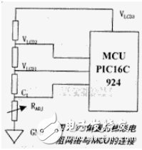 LCD驱动电压的产生有两种办法,内部充电泵法或者外部梯形电阻网络法。由于LCD充电泵正处在发展中,为了使设计风险减小,我们采用较为成熟的外部梯形电阻网络法。使用外部梯形电阻网络时,VGEN(LCDCON《4》)应清零。