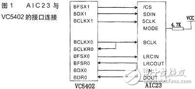 AIC23通过数字音频口与DSP的McBSP0完成数据的通信,DSP做主机,AIC23做从机。主机提供发送时钟信号BCLKX0和发送帧同步信号BFSX0。在这种工作方式下,接收时种信号BCLKR0和接收帧同步信号BFSR0实际上都是由主机提供的。图1是AIC23与VC5402的接口连接。