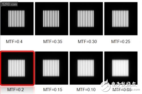 MTF是实际像与理想像之间①调制度之比相对空间频率的函数,通俗讲就是测量不同空间频率下镜头反差的还原程度,它能同时反映镜头的反差及分辨率。 因为实际光学系统存在像差、反射、吸收等因素,影像与标版反差无法完全一致,所以MTF总介于0~1之间,MTF值越大,图像越清晰。如图一,MTF=0.4时最清晰;MTF=0.05时,图像最模糊。