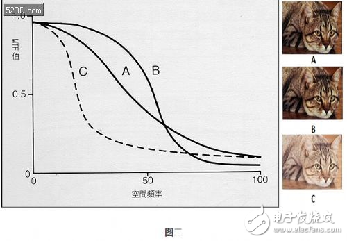 曲线C表示镜头在低频时MTF衰减就很快,综合性能较差。从图C中也可以发现画面深浅色反差较低,层次感较差。