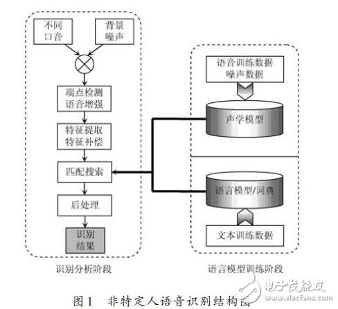 非特定人语音识别技术研究的最终目的是让计算机等设备能够“听懂”人类语音,提取出语音中所包含的特定信息,成为人机通信和交互最便捷的手段。由于语音信号本身具有不确定性、动态性和连续性,这就为准确量化和处理该信号带来非常大的困难,每个人的语音要建立不同的语音样本也为识别的普及带来瓶颈约束。目前的语音识别是先建立特征库然后将待识别的信号经处理与特征库比对得到相似结果判定输出。从本质上属于基于统计模式的基本理论,分语言模型训练、识别分析两个大阶段构成和实现,如图1所示。