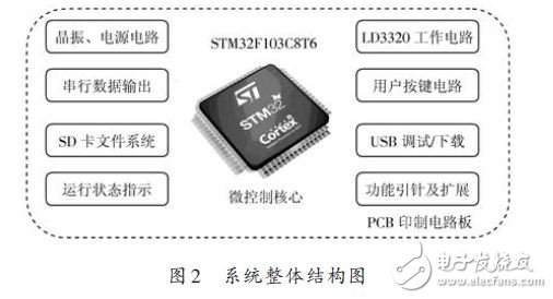 本系统以STM32F103C8T6 微控制器为控制核心,搭配微控制器最小核心电路、LD3320语音识别电路、SD卡电路、电源电路、用户按键输入电路、串口数据输出电路、状态指示电路等综合组成。该系统体积小巧,可以作为嵌入式组件单元融入用户电路或者板卡中,上电后STM32F108C8T6内部程序进行程序初始化、SD 卡文件系统初始化、LD3320初始化、随后等待识别音频接收,识别完成后输出响应信息或者解码音频,系统整体结构如图2所示,最终实现积木式功能组件的全部功能。