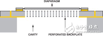 像ECM一样,MEMS麦克风也是电容麦克风。MEMS麦克风包含一个灵活悬浮的薄膜,它可在一个固定背板之上自由移动,所有元件均在一个硅晶圆上制造。该结构形成一个可变电容,固定电荷施加于薄膜与背板之间。传入的声压波通过背板中的孔,引起薄膜运动,其运动量与压缩和稀疏波的幅度成比例。这种运动改变薄膜与背板之间的距离,进而改变电容,如图1所示。在电荷恒定的情况下,此电容变化转换为电信号。