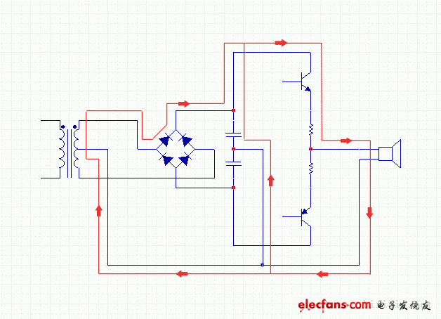 如图中正半周音频信号为例,信号经功放管、射极电阻、扬声器、地,分为两个通道,一部分经过电源变压器、整流管形成回路,一部分经滤波电容形成回路。显然,变压器电感量十分大,不利于音频中高频部分的通过,仅可通过频率很低的低频音频信号,仅可为次低音提供通路,更多的音频信号特别是高频部分的信号则经电源滤波电容形成回路。电容与变压器次级相得益彰,为音频提供了从直流到高频的频带通路。