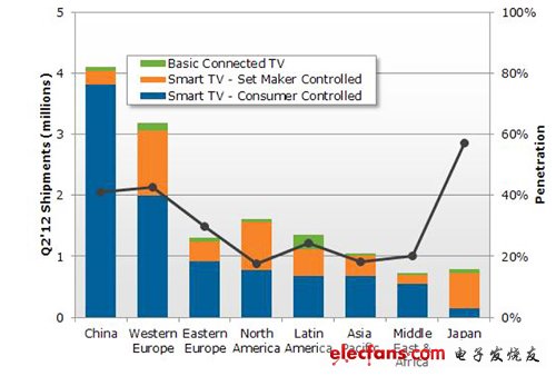 图1 2012第二季各地区智慧电视出货量与渗透率统计