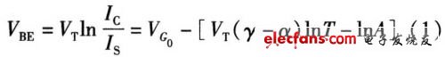 式中VG为带隙电压,γ和α为器件参数,A代表了那些方程推到过程中与温度无关的常量。因为Vt=kt/q,可以得到VBE随温度上升是降低的。其关于温度变化的方程为