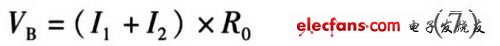 B点的电压为电阻上的电压,可由欧姆定理计算得到。计算温度上升翻转点TH,当温度上升时,由前分析可知,TSD为高电平,M2截止。因此流入R0的电流只有I1一路。此状态下VB电压的表达式为