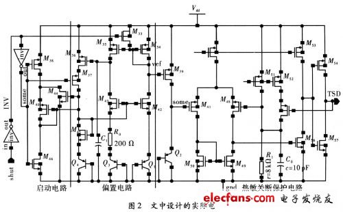 图1为本设计的原理架构,Q1为NWELLCMOS工艺中寄生PNP三极管,其集电极是必须与地点位连接,为了利用寄生PN结导通正向导通电压的负温度特性,把Q1做二极管连接(基集也接到地),这样A点和地之间的电压VA就具有了PN结正向电压的与温度成反比的性质。由于基准电路输出的偏置电压加在M0、M1、M5的栅极上,则其所在支路上都会产生PTAT电流 (Proportional to Abso-lute Temperature);在提供偏置的同时,也在电阻R0上产生了与温度成正比的电压VB即B点电压随之增大。当达到某一温度TH(设定的关断温度) 后,VH≥VA、比较器Comp输出高电平,经过倒相器INV后,输出TSD为低电平;此信号作用于电路的其它模块后,使整个芯片停止工作,实现热保护功能。同时,TSD信号正反馈作用于M2栅上,开启M2,加大了电阻R0上电流,使VB更高。