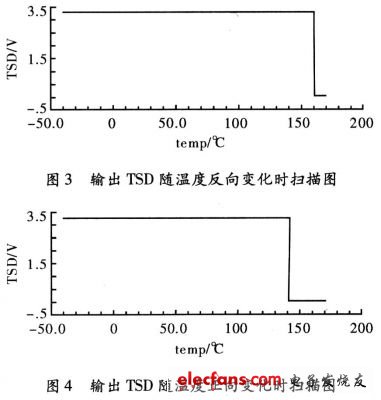 按 照以上设计的电路。用Cadence Specture对其进行仿真,器件的模型参数采用0.35μm CMOS工艺。图2为过温保护电路的输出控制信号TSD,随温度上升和下降的曲线。电源电压取3.3 V。从仿真结果可以看出,该电路实现了良好的“温度迟滞”特性。迟滞功能有效的避免了芯片出现热振荡问题。关断温度TH160°和恢复温度TL140°。