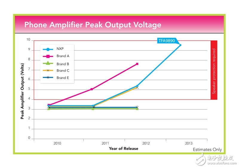 中国上海,2013年3月4日讯——为力争实现更佳的音质和更大的输出音量,领先的手机制造商一直在提升用于驱动微型扬声器的内部电压——从3.3V到5V,而最近更是高达8V。在上周举行的2013全球移动通信大会上,恩智浦半导体(纳斯达克代码:NXPI)推出了其全新的TFA9890扬声器驱动器IC,它让集成式DC/DC转换器实现了无可比拟的9.5V升压电压。增加音频驱动器IC的电压裕量可防止放大器剪峰,并在最大音量处保持较高的音质。TFA9890是目前性能最强大的用于微型扬声器的驱动器,它可安全驱动破纪录的4 W峰值功率至标准8欧姆扬声器(典型额定值为0.5 W),明显提高了手机、平板电脑、电视机和便携式扬声器的声音输出和音质。