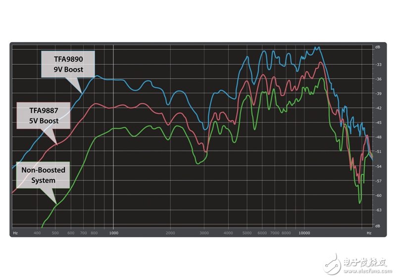 凭借其基于反馈原理的扬声器振幅保护算法,TFA9890这款集成了恩智浦CoolFlux DSP、一个带电流检测的D类放大器和一个DC-DC转换器的单芯片器件,可向8欧姆扬声器提供的功率几乎是TFA9887所能提供的两倍,并且声音输出典型值也要高6-12 dB。除了增大扬声器音量,DC-DC转换器的9.5V升压电压还可通过增加电压裕量和消除放大器削波来提高音质。
