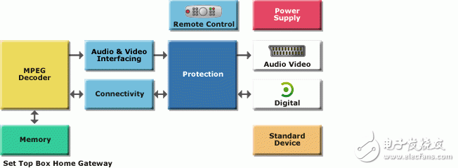 IPTV机顶盒可供用户通过宽带连接浏览、观看网络电视和其他网络内容,标清 (SD) 或高清 (HD) 取决于使用的MPEG解码器类型。 以下示例为独立IP机顶盒,但ST也支持混合IP机顶盒,除IP外,还可以连接另一媒体模式 (有线、卫星或数字地面电视广播)。