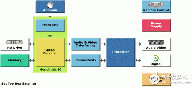 卫星广播机顶盒是基于QPSK系列的调制方案,由一些前端标准清晰度(SD)或高清晰度(HD)的MPEG解码器所组成, 并且应用了先进的视频编码技术。