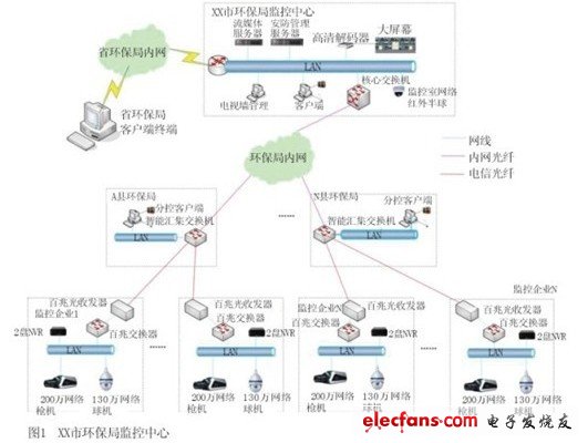 1、排污监控点采用光纤收发器通过光纤汇聚到县环保局并接入县环保局汇聚交换机。