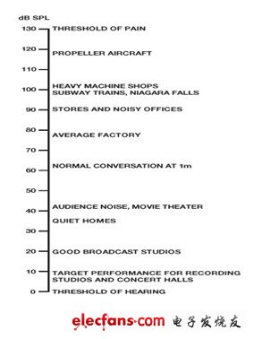 作为参考,图4显示了各种声源的典型SPL,从安静的录音棚(10 dB SPL以下)到痛阈(130 dB SPL以下),痛阈指声音给正常人带来痛苦的点。麦克风很少能整个覆盖——甚至大致覆盖——该范围,因此,针对所需的SPL范围选择正确的麦克风是一个重要的设计决定。应利用灵敏度规格,使麦克风在整个目标动态范围内的输出信号电平与音频信号链的常见信号电平相匹配。