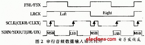 CS4224和TMS320C32采用串行方式连接。CS4224的串行数据线SDIN和SDOUT分别与TMS320C32的串口数据线DR和DX直接相连,数据移位时钟SCLK与数据收发时钟CLKX和CLKR相连,左右声道时钟LRCK经二倍频后作为收发帧同步时钟FSX和FSR。工作时序见图2。