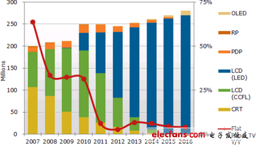 2007-2016全球电视机按不同技术别出货量预估(单位:百万台)
