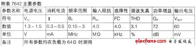 这种卡片式收音机初用时尚可,其最大的缺点是可调电容易磨损,用了不到一个月便出现明显的噪声而且易跑台。该收音机电路部分采用了微型收音机集成电路7642,与之类似的还有85414、IN414、MK484和NT484等几个型号。这些型号的集成电路,一般可以通用。其主要的参数如附表所示。