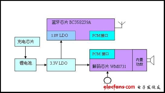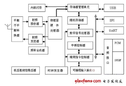 BC358239A芯片频率范围2.402~2.480Ghz,发射功率可高达+4dB,内置有8比特DAC(数模转换器)可自动调整发射功率,无需外部 BALUN(平衡不平衡转换器和功放即可符合蓝牙V1.2规格;0.1%BER(比特误码率)时典型接收灵敏度-85dB;全集成的频率合成器,可支持 8~40Mhz外部时钟输入又可外接CRISTAL(晶振);内部集成DSP(数字信号处理器)速度可达32MIPS,32bit指令字,24bit数据存储器,内置4K字程序存储器,两个8K字数据存储器,足以支持耳机应用软件设计需要;片上LDO(低压差线性稳压器),支持u-law和A-law 语音代码转换,支持I2S又支持PCM语音接口, 深度睡眠模式功耗不超过10uA;10x10mm 的LFBGA封装,只需较小的PCB尺寸。BC358239A内部结构见图二。