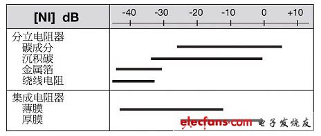 下面图表显示了使用不同技术制造的电阻器的噪声指数。