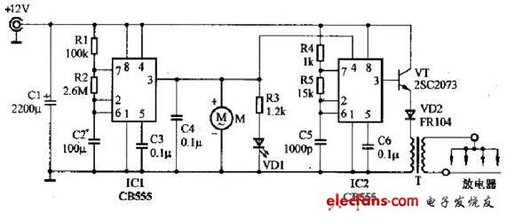 当IC2输出端(3脚)为高电平时,开关管VT导通,12V电源经二极管VD流经变压器T的初级绕组。当IC2输出端(3脚)为低电平时,开关管VT截止,变压器T储存的能量通过其次级释放。由于T的初、次级变压比达1:300,次级脉冲电压将高达3000V。以上,通过放电器的尖端放电使空气电离而产生负离子。风扇M的作用是使负离子更快更好地扩散到周围空气当中去。