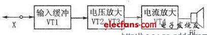 (Sl指向“xJ”)可见,信号寻迹器电路的主要元器件是4个晶体管。以这4个晶体管为核心,可将电路图分为3个单元,从左到右依次为:①以晶体管VT1为核心的输入缓冲单元;②以晶体管VT2和VT3为核心的电压放大单元;③以晶体管VT4为核心的电流放大单元。以上单元电路组成了音频信号寻迹器的整体电路,右图为其方框图。其电路工作原理是:由探针X从被检测电路取出的微弱的音频信号,经VT1缓冲后送入VT2、VT3进行电压放大,再经VT4电流放大后推动扬声器BL发声。下面我们从左到右依次分析电路图各单元电路。