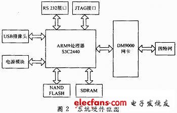 目前最流行的以太网控制器是DAVICOM公司的DM9000网卡芯片,该芯片自适应10 Mb/s和100 Mb/s的网络,处理器通过GPIO与网卡相连,支持3.3 V接口电压,32位接口存储器可以方便直接与S3C2440相连,在连接RJ-45接口,即可实现以太网物理层和数据链路层的连接。设备驱动程序在Linux操作系统下可以方便的移植,故选择此网卡芯片作为以太网控制器。摄像头采用市场普通USB摄像头,即插即用,处理器通过USB控制器控制摄像头。